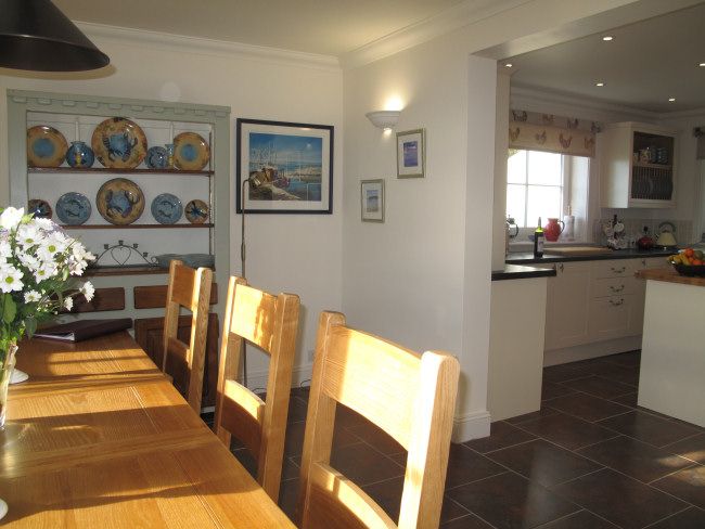 The sitting room is open plan with the stairs and porch, and has a multi-burning stove. There are oak floors and tiles with underfloor heating throughout downstairs.